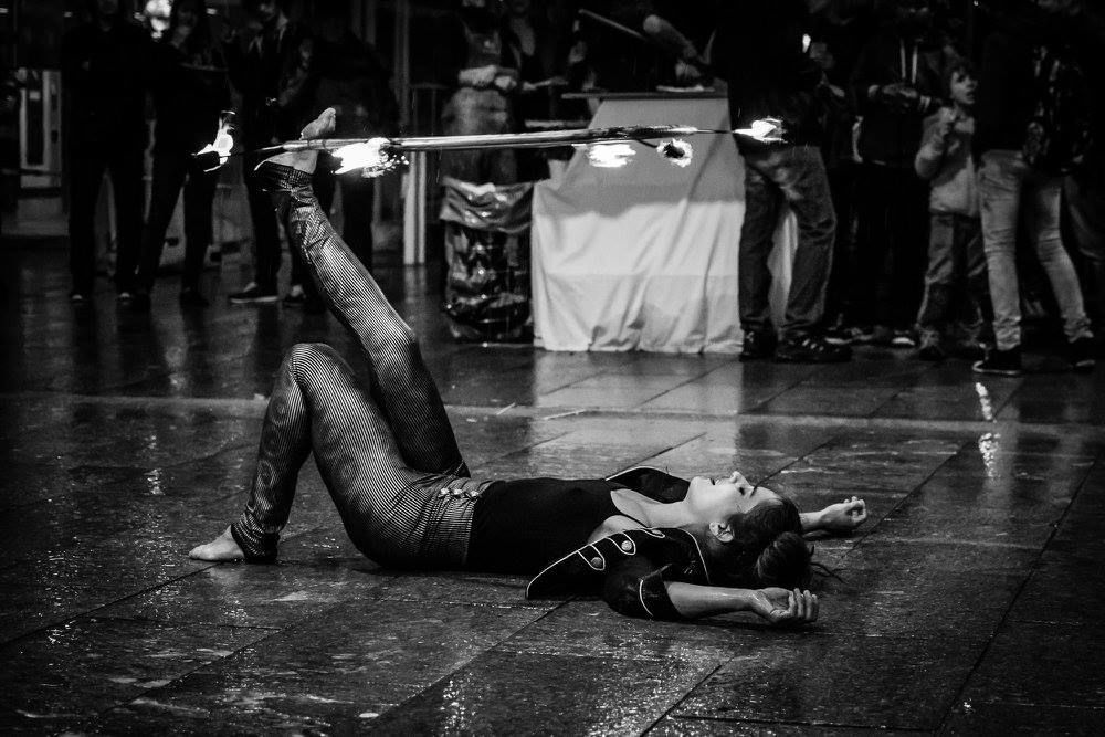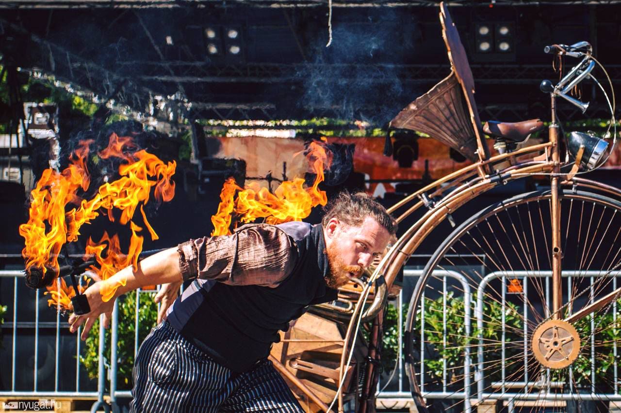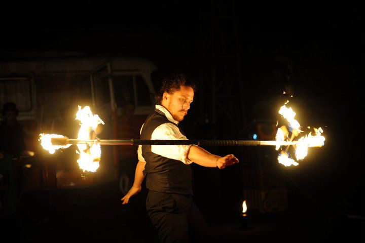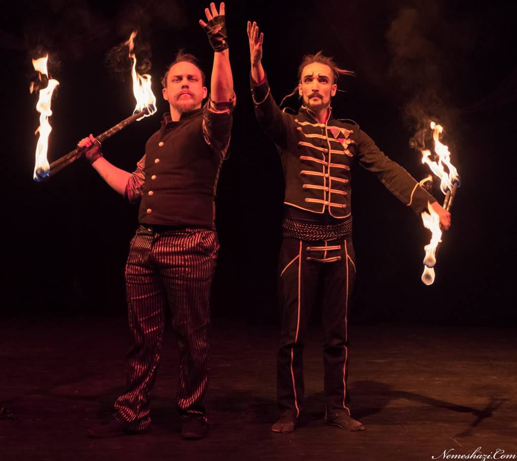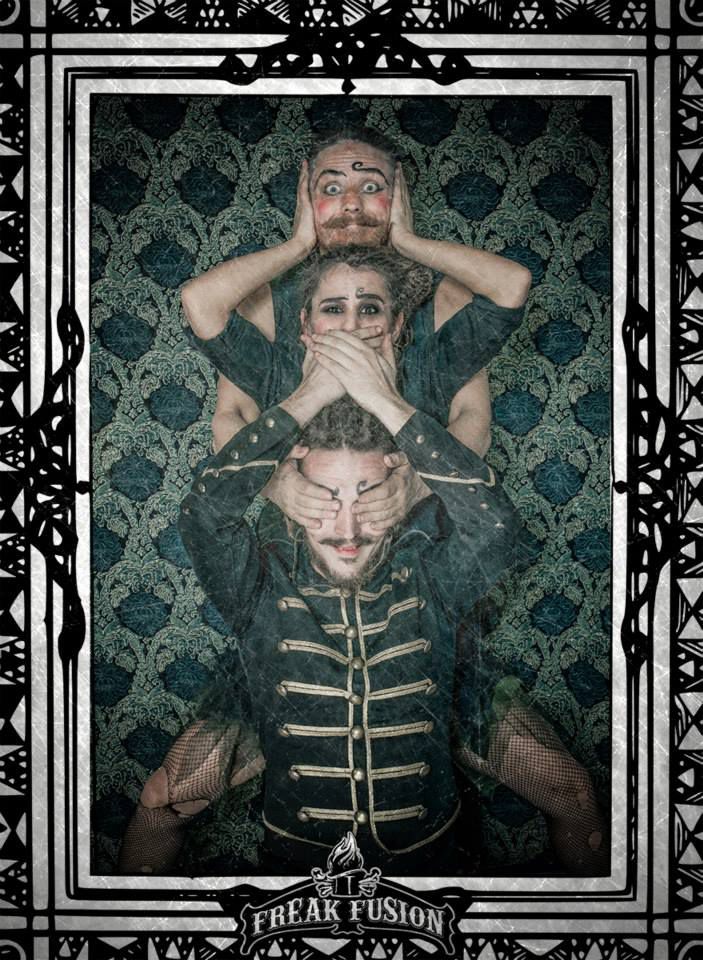 A fire juggler-style street show. The well-oiled trio is fooling around like nothing else matters, competing non-stop with skillful fire twirling, props flying sky-high. With their elevated humour and golden circus uniforms these bigger than life characters will steal anyone’s heart in a minute
