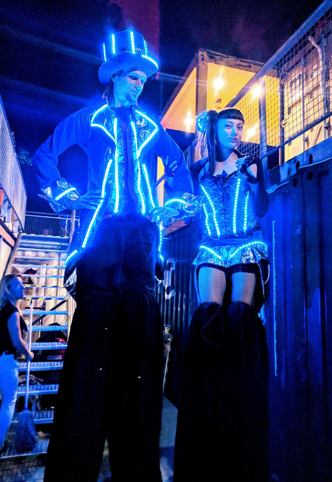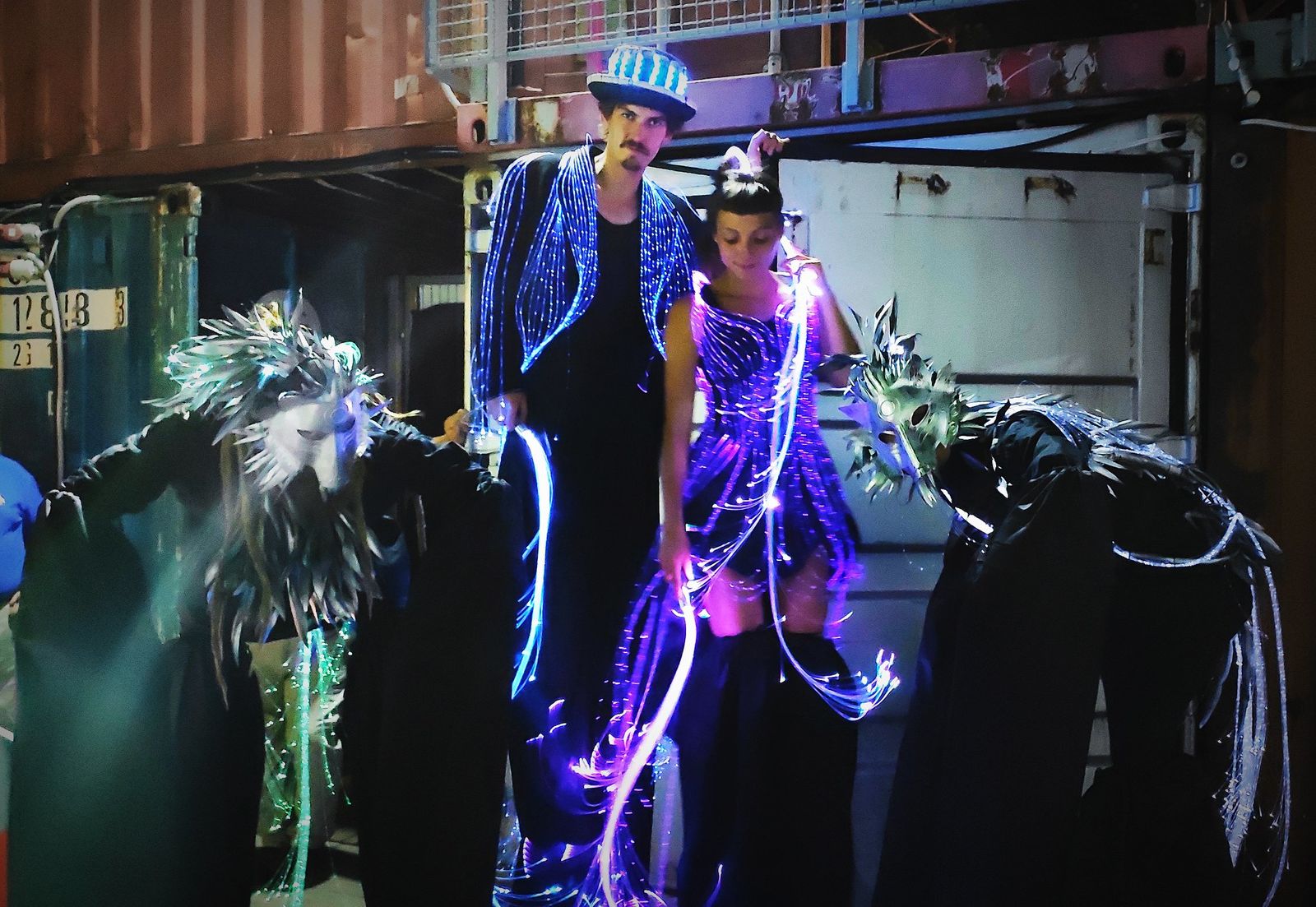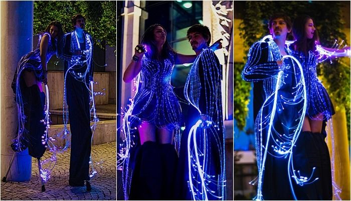 Our stiltwalkers can serve many of your purposes: a spectacular walkabout, handing out leaflets and flyers (this is very effective from the hands of a giant) or an independent performance. Stiltwalking characters range from the white fairy or the medieval jester to the elegant gentleman or the steampunk bandit.
